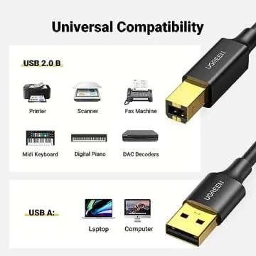 Show more The UGREEN 5ft USB A to B Printer Cable is an essential accessory for anyone seeking a reliable and efficient connection to their printers and scanners. This high-speed cable is designed to seamlessly connect various devices, including popular brands like HP, Canon, Brother, Samsung, Dell, Epson, Lexmark, and Xerox. Say goodbye to the frustrations of wireless printing with this premium quality cable, ensuring you have a stable and hassle-free experience. With an impressive 480 Mbps transfer speed, it's designed for efficiency without compromising performance.