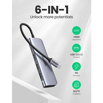 UGREEN USB C Hub 6 in 1 Dongle to HDMI 4K 2 USB 3.0 Ports SD TF Card Reader 100W PD Charging Adapter Dock Station for MacBook Pro Air 2020 2019 2018 Galaxy Note 10 S10 S9 S8 Surface Go XPS 13 15