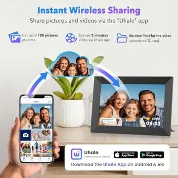 Show more Introducing the Uhale 10.1" Digital Picture Frame, your ultimate companion for sharing and displaying cherished memories in stunning clarity! Designed with smart technology, this innovative digital photo frame connects effortlessly to Wi-Fi, allowing for instant and private photo and video sharing from anywhere in the world through the fr-ee Uhale APP. Boasting a vibrant 1280x800 HD IPS touch screen, it ensures that every cherished moment is presented with brilliant colors and sharp details, making it a delightful addition to any room.