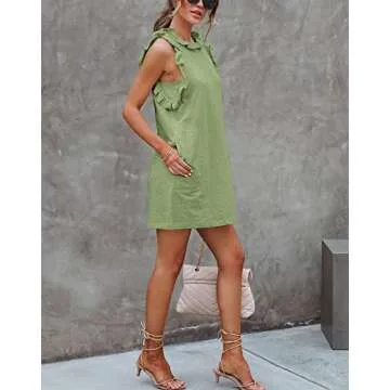 Show moreIntroducing the ultimate warm-weather essential for any fashion-savvy individual - the Uincloset Women's Summer Sleeveless Ruffle Sleeve Mini Dress. Crafted from an incredibly soft, breathable fabric that effortlessly combines comfort and style, this stunning dress is perfect for everything from sunlit brunches to romantic beach outings. Its lightweight and stretchable material provide a relaxed fit that flatters all body types and ensures that you stay cool even on the hottest days. With a charming design that highlights ruffle trimming and sleeveless shoulders, this dress is both cute and chic, making it a standout piece in your wardrobe.