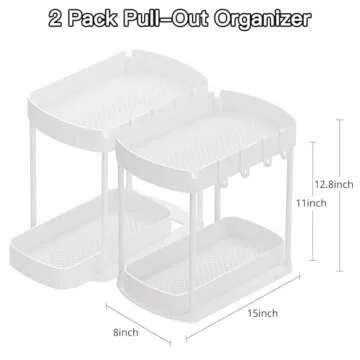 Show moreIntroducing the Ukeetap 2 Pack Multi-Purpose Pull-Out Storage Organizers, your ultimate solution to clutter and chaos in any room! These versatile organizers, each measuring 15” x 8” x 12.8”, are designed to fit seamlessly in various spaces including bathrooms, kitchens, and under sinks. Made with premium thick plastic and reinforced with a sturdy metal tube, these organizers are not just functional but also built to endure daily use without deformation. Whether you're a meticulous organizer or someone who just needs a little help keeping things tidy, the Ukeetap storage organizers will elegantly fulfill your needs.