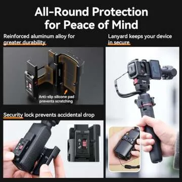 Its quick setup is enhanced by multiple quick-release interfaces around the frame body, ensuring a smooth transition between accessories. Designed with every detail in mind, the adapter features reinforced aluminum for superior durability, a security lock to prevent accidental drops, and an anti-slip silicone pad to avoid scratching. With the recommended lanyard, your device remains secure, making this an essential tool for anyone serious about photography or videography.