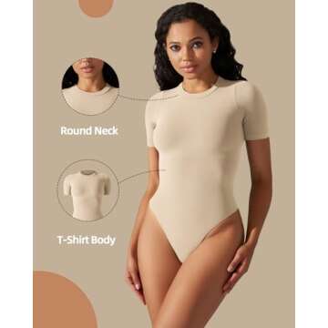 ULSFAAR Women's Bodysuit Shapewear Round Neck Shorts Sleeve Soft Thong Jumpsuit Tummy Control(Sand,M)