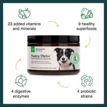 Show more If you want your furry friend to thrive, Nutra Thrive is the perfect food topper! This bacon-flavored powder is designed to enhance any dog food, and it contains a rich blend of easily absorbed vitamins, minerals, antioxidants, and digestive enzymes. Created by Ultimate Pet Nutrition, each scoop of Nutra Thrive packs a nutritional punch, ensuring your pet receives the essential nutrients they need for optimal health.