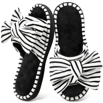 Show moreIndulge your feet in the ultimate comfort with these stylish house slippers that redefine relaxation. Crafted with elegant stripes and a charming bow, these slippers elevate your home footwear game while providing unmatched coziness. The ultra-soft insole and upper ensure your feet feel pampered, allowing you to slide in whenever you’re in need of a little rest. Experience the luxury of high-density memory foam and cushioning EVA insole that feels like walking on clouds. With every step, you'll fade away the stress of the day as they offer ample support, helping to alleviate foot fatigue and discomfort.