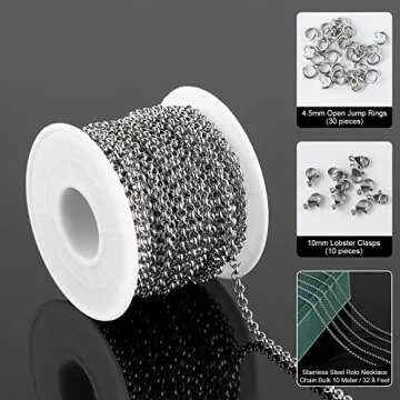 Show more Introducing a brilliant solution for all your DIY jewelry-making needs - our premium 32.8 Feet Stainless Steel Link Chains set. This comprehensive package includes a generous length of sturdy stainless steel chain, accompanied by 10 robust lobster clasps and 30 versatile open jump rings. The chain itself, measuring approximately 3mm in width and length, is perfect for creating stunning necklaces, bracelets, and other adornments. With a focus on durability, this chain is specifically designed to withstand daily wear and tear, making it an ideal choice for both novice and experienced crafters alike.