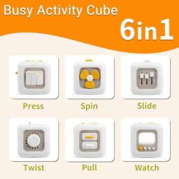 Show more This busy board cube is an engaging and versatile travel toy designed specifically for toddlers aged 1 to 3 years. Its compact design houses an array of activities catering to the natural curiosity of young children. With features that include mirrors, sliders, pull-out drawers, buttons, rotating fan blades, and a twistable timer, this busy board guarantees continuous engagement for your little adventurer while on the go.