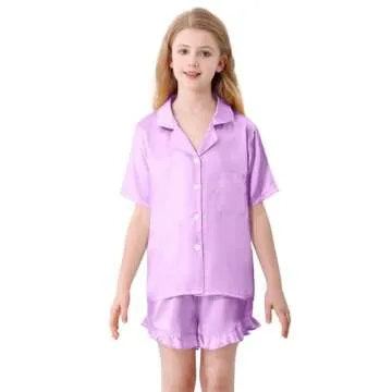Umeyda Girls 3 Pieces Pajamas Sets Silk Satin Ruffle Sleepwear Short Sleeve Button-Down Nightwear, Light Purple, 11-12 Years