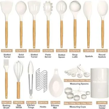 This complete set includes essential tools like a flexible spatula, soup ladle, serving spoons, pasta server, spatula turner, tongs, and measuring cups and spoons. With 10 hooks and a stylish silicone mat for convenient storage, your kitchen will never be cluttered again. Not only do these utensils protect your cookware from scratches and dents, but their sturdy wooden handles ensure your hands stay safe from heat while cooking.