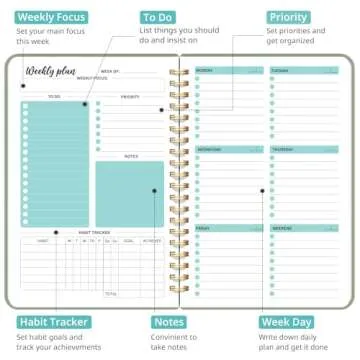 Measuring at a convenient 6.1'' x 8.2'', this planner fits neatly into your bag, making it your go-to tool for daily organization. The format allows you to jot down weekly goals and to-do lists, ensuring that every task is assigned its rightful place. Moreover, it promotes a healthy lifestyle with dedicated sections for tracking your habits through visual reminders, making your journey towards well-being simpler and more enjoyable.