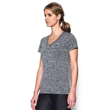 Show moreIntroducing the Under Armour Women's UA Tech™ Twist V-Neck in MD Black, a must-have addition to your athletic wardrobe. Crafted from super-soft UA Tech fabric, this shirt promises unbeatable comfort, making it your go-to option for workouts, casual outings, or lounging at home. Its innovative Signature Moisture Transport System actively wicks away sweat, keeping you dry and light during your most intense sessions. The lightweight stretch construction enhances mobility, allowing for a full range of motion whether you’re on a run, at the gym, or striking your yoga poses. Designed with a deep V-neck collar, this shirt not only provides a stylish edge but also offers a slimmer fit for a flattering, feminine silhouette. With an added anti-odor technology, you can wear it longer without the worry of unwanted smells. Perfect for any active lifestyle!