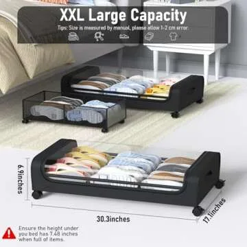 Show more The Under Bed Storage with Wheels is the ultimate solution for maximizing your storage space while keeping your home organized and clutter-free. This innovative storage unit measures 32 by 17 by 6.9 inches, making it ideal for most beds and ensuring efficient use of out-of-sight spaces. With a generous storage capacity, it offers ample room for bulky clothing, bedding, shoes, and even seasonal decor. Boasting a robust 66lb load-bearing capacity, this sturdy metal under bed storage drawer is designed to withstand the weight of your essentials, unlike flimsy fabric alternatives.