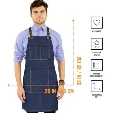 Show moreIntroducing the Under NY Sky Essential Blue Denim Apron, where craftsmanship meets functionality in a stylish and durable design. This isn’t just any apron; it’s a carefully handcrafted piece made from mid-weight 9 oz cotton denim, ensuring longevity and strength. It features 100% cotton straps that not only provide a soft touch, avoiding potential allergies but also enhance your comfort during use. The apron is reinforced with genuine leather patches and is equipped with a vintage brass metal hardware that adds a touch of elegance while providing durability against wear and tear. Additionally, the long-lasting anti-rust and anti-allergic Zamak coating on the hardware ensures it remains pristine and functional, even after extensive use. The design is practical, featuring double-stitched utility pockets designed to safely hold your essentials without ripping or tearing over time.