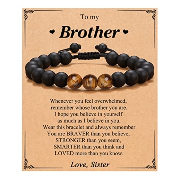 Show moreThe perfect gift for a beloved brother has arrived: a beautifully crafted bracelet designed to foster the bond between siblings. This thoughtful piece of jewelry, adorned with meaningful inscriptions, serves as a constant reminder of the love and support siblings share. Made by a reputable brand, this bracelet features natural tiger eye stone and black agate stone, chosen for their aesthetic appeal and durability. Its lightweight design ensures comfort, allowing your brother to wear it throughout the day without frustration. The message inscribed on the bracelet is heartwarming: 'Whenever you feel overwhelmed, remember whose brother you are. I hope you believe in yourself as much as I believe in you.' This quote encapsulates the sentiment of encouragement and belief in his potential, making it a truly personalized gift.