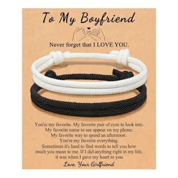 Show moreOur meaningful matching bracelets are the perfect emblem of love and connection for couples. These bracelets, crafted with care from durable, handmade braided rope, serve as a beautiful reminder of your bond. The lightweight design ensures comfort, allowing both you and your boyfriend to wear them throughout the day without any discomfort. Each bracelet comes with a vintage charm that adds a touch of elegance, making it an ideal accessory for various occasions. The versatility in style means these bracelets can complement any outfit, from casual to formal wear, making them not only meaningful but also stylish. In addition, the adjustable design accommodates wrist sizes up to 13 inches, ensuring that they fit comfortably on most wrists. They have been designed not just for aesthetic appeal but also for longevity, promising to withstand daily wear. The set also comes in a beautiful jewelry bag and includes a heartfelt card, enhancing the gifting experience. Every bracelet is a promise and a cherished keepsake, making it an extraordinary gift for your boyfriend. Show him just how much he means to you with this thoughtful gesture that can be worn every day.
