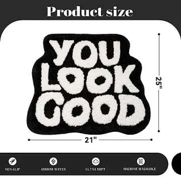Show more Introducing the UNIBATH You Look Good Bath Mat—where functionality meets playful charm. This 25”x21” bathroom rug is designed with a delightful black and white pattern that not only looks adorable but also perfectly complements any bathroom décor. Constructed from 100% polyester microfiber, it offers exceptional softness underfoot, ensuring you step onto luxury every time you leave the shower. The high-density pile is thicker than ordinary mats, delivering unrivaled comfort while shielding your feet from cold tiles.