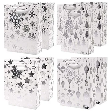 Show more Introducing the UNIQOOO 12Pcs Metallic Silver Christmas Gift Bags Bulk, a perfect way to elevate your giving experience during the holidays! Measuring at a convenient size of 9¼ x 7 x 4 inches, these medium-sized gift bags come with beautifully assorted designs, featuring sparkling silver stars, festive snowflakes, delightful Christmas ornaments, and charming tree farm motifs. Crafted with premium 210g paper material, these bags showcase a blend of style and durability, ensuring your gifts are presented in a fashionable yet sturdy manner. Whether you're wrapping up gifts for the office party or preparing festive gifts for family and friends, these unique bags add flair and make your presents stand out.