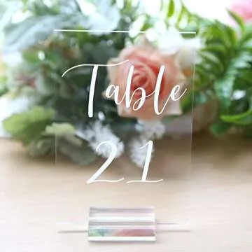Show more Elevate your special celebration with the UNIQOOO Acrylic Wedding Table Numbers set. Featuring beautiful calligraphy in a clear 4x6 inch design, these high-quality table numbers seamlessly combine elegance with functionality. Crafted from premium acrylic, the numbers are not only visually striking but also remarkably durable, ensuring they withstand the hustle and bustle of your wedding reception and other events. With each number easily visible from a distance, guests will quickly find their tables without distraction from your beautiful flower arrangements.