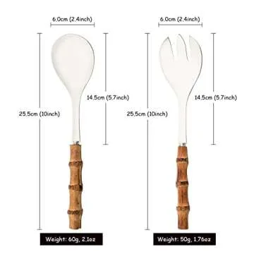 Show moreDiscover the Uniturcky Serving Spoon and Fork Set, an exquisite fusion of style and practicality that transforms any dining occasion into a memorable experience. Crafted with precision, this 4-piece set includes two elegantly designed serving spoons and two forks, each measuring 10 inches long. The bamboo handles lend a touch of tropical elegance, making this set a stunning addition to both formal dinners and relaxed outdoor gatherings. The creative craftsmanship of this set guarantees not only functionality but also artistic flair that enhances your table decor.
