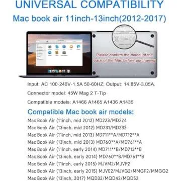 Show moreMeet the AC 45W Power T-Tip Connector Adapter, your ultimate solution for keeping your MacBook Air and older MacBook Pro charged and ready for action. Specially designed for seamless compatibility with models from 2012 to 2017, this charger delivers a potent 14.85V 3.05A output that guarantees your device will power up swiftly and efficiently, ensuring you're never left stranded with a dead battery. Whether you need a backup for travel or a replacement for a malfunctioning charger, this reliable accessory is skillfully crafted to meet your needs.
