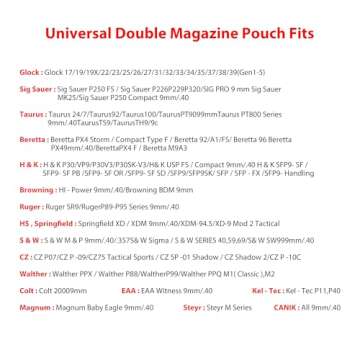 Show moreIntroducing the Universal Double Magazine Pouch, your ultimate solution for efficient and secure firearm magazine carrying. Designed to accommodate a wide range of 9mm and .40 caliber dual stack magazines, this high-quality magazine holder is compatible with numerous firearm brands, including Glock, Sig Sauer, Beretta, and many more. With its state-of-the-art features such as adjustable retention and carry angle, the Double Mag. Belt Holder ensures a comfortable and personalized fit for any user, whether you're at the shooting range or on duty.