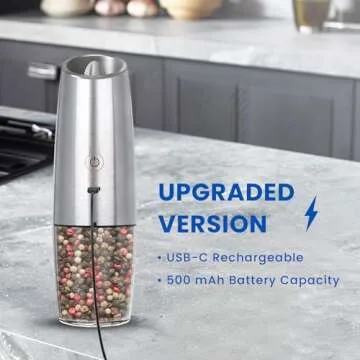 Show moreTransform your culinary experience with the **UNNEES Rechargeable Electric Salt and Pepper Grinder Set**, an essential gadget for every culinary aficionado. This sleek and modern set of two grinders offers unprecedented convenience, fitting perfectly into the fast-paced lifestyle of contemporary cooks. Whether you’re grilling, sautéing, or creating gourmet dishes, these electric grinders help you achieve the perfect seasoning every time. With their rechargeable feature via a Type-C USB charger, you no longer need to worry about constantly replacing batteries—making it good for your kitchen and the planet!