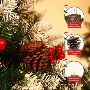 Show more Transform your holiday season with the exquisite charm of these genuine NATURAL PINECONES, thoughtfully designed to hang anywhere in your home. With their attractive gold string loops, these pinecones serve as delightful decorations for your Christmas tree or as standalone accents throughout your living space. Each pinecone boasts a TOUGH AND WOODY texture, ensuring durability that can withstand both indoor and outdoor environments for years to come.