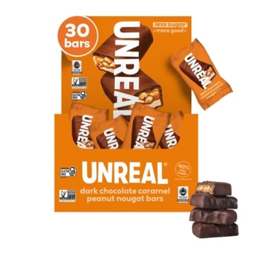 Show moreDiscover the indulgent pleasure of UNREAL Dark Chocolate Caramel Peanut Nougat Bars, where heavenly taste meets nutritional integrity. Crafted to perfection, each bar is a little treasure filled with a fluffy nougat center, a generous layer of crunchy peanuts, and a rich, gooey caramel, all enveloped in luscious dark chocolate. Unlike any other, these bars stand out as the only caramel nougat option on the market that is completely free of soy ingredients, making them a guilt-free indulgence for those with dietary restrictions. The package contains 30 individually wrapped mini bars, making them ideal for any occasion – whether it's a sweet pick-me-up at work, a delightful treat in your child's lunchbox, or a decadent dessert shared with friends.