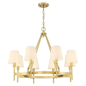 Show more Illuminate your living spaces with the Untrammelife Gold Wagon Wheel Chandelier, a stunning 8-light modern farmhouse round chandelier that perfectly blends elegance with functionality. This striking lighting fixture features a generous 30-inch diameter, ensuring an abundance of light coverage that bathes your home in a soft, warm glow. The chandelier's white fabric shades not only diffuse the light beautifully, creating a cozy atmosphere, but also protect the eyes from harsh brightness, making it ideal for households with children. Moreover, the fabric shades serve as a canvas for creativity; you can enhance their appearance with your own embroidery or artwork, personalizing your chandelier to reflect your unique style.
