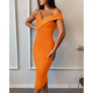 UONBOX Women's Cut Out One Shoulder Sleeveless Split Club Party Fashion Bandage Dress (XL, Orange)