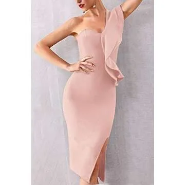 UONBOX Women's One Shoulder Sleeveless Knee Length Side Split Fashion Bandage Dress (M, Apricot)