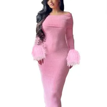 UOYQAS Women's Off Shoulder Bodycon Dress Feather Long Sleeve Elegant Cocktail Evening Party Midi Dresses Pink