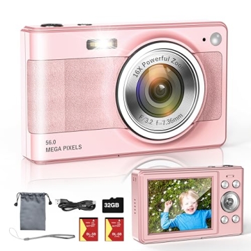 Upgrade Digital Camera for Kids - 56MP Compact Camera with 16x Zoom in Pink