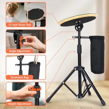 Show moreIntroducing the Upgraded 12 Inch Practice Drum Pad with Stand – a complete drumming solution designed for enthusiasts of all skill levels. This drum practice pad not only features a double-sided design with a high-density silicone surface that mimics the feel of real drumming, but it also comes equipped with an EVA polymer mat on the bottom for exceptional soundproofing and shock absorption. Perfect for honing your skills, whether at home, in a studio, or on the go, this pad ensures that you can practice anywhere without disturbing others. Each set includes a pair of high-quality maple drumsticks and a convenient carrying bag, making it easy to take your music anytime.