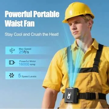 - 5-Speed 16000 RPM Turbo Airflow: Equipped with a high-speed 16000 RPM brushless motor, this waist fan delivers up to **25ft/s** of cooling power. Select from **five adjustable wind speeds** to personalize your airflow experience, ensuring just the right amount of breeze whether you prefer a gentle flow or robust cooling for intense outdoor activities.