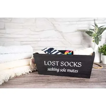 Show moreIntroducing the UpTrend Design Lost Socks Basket, the perfect blend of functionality and style for your laundry room! Say goodbye to the frustration of mismatched socks with this adorable wooden hamper, adorned with the charming phrase 'Lost Socks Seeking Solemates.' This delightful piece not only serves as a practical sock organizer but also spruces up your laundry decor. Measuring a compact size of 11x6x4 inches, this rustic black wood hamper effortlessly fits into any space, making it an ideal choice for those seeking organization with a fun twist.