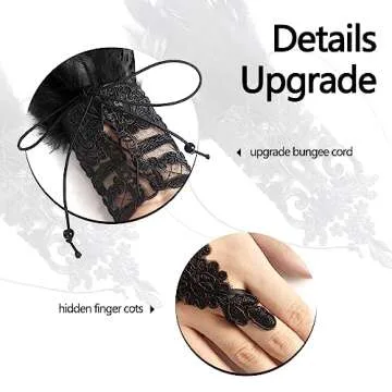 Show moreElevate your style this Halloween with the exquisite UQJE Women's Feather Lace Long Gloves. This stunning set includes two pieces, incorporating luxurious natural feathers and delicate lace, making them the perfect accessory for any festive occasion. Designed not just for aesthetics, these gloves are crafted for comfort, allowing you to dance the night away worry-free. The elaborate feather detailing adds a unique flair, ensuring you stand out among the crowd, whether you're dressing as a gothic witch or embracing a vintage goddess.