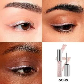 Show more Unleash your inner artist with the URBAN DECAY Moondust Liquid Glitter Eyeliner in the enchanting shade of Grind - a light pink iridescent glitter that brings your eyes to life with cosmic sparkle. This innovative eyeliner features a clear, water-based formula infused with superfine, multidimensional glitter, allowing you to create a dazzling look that is both buildable and quick-drying. Say goodbye to fallout and hello to long-lasting shimmer as this liquid liner effortlessly stays put throughout the day!