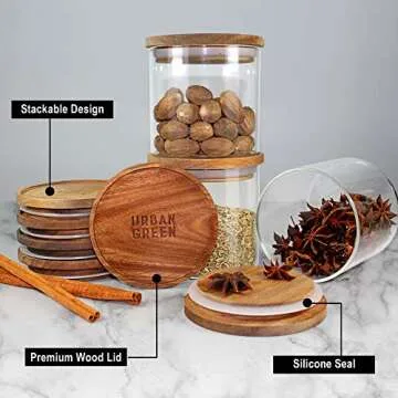 Urban Green Glass Jars with Airtight Lids, Airtight Glass Canisters with Wood Lids, Glass Storage Containers with Bamboo Lid, Food Storage Containers, Glass Canister Sets (6 Pack of 27oz)