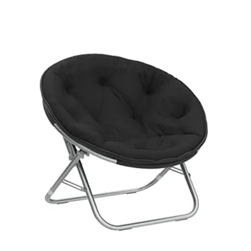 Show moreIntroducing the ORIGINAL SAUCER CHAIR, a perfect blend of style, comfort, and functionality that transforms any designated space into a cozy retreat. This exceptional saucer chair arrives in an elegant neutral black hue, elegantly fitting into various room decors from chic modern to playful youthful. Designed by a reputable brand, this saucer chair features a durable yet stylish silver metal frame that enhances its structure and aesthetic appeal. You can effortlessly enhance the atmosphere of your living room, bedroom, or game room with this versatile piece. You can also maximize seating options without experiencing the chaos of assembly, as this lovely chair comes ready to use—just unfold and position it to your liking.