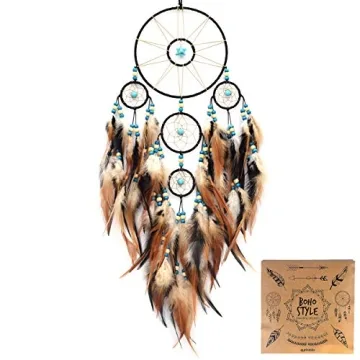 Show moreThe Five Rings Dreamcatcher Wall Decor is a stunning piece that brings traditional Indian artistry into your home. Handcrafted with intricate black and brown feathers, this dreamcatcher does more than just serve as a decorative item; it embodies a centuries-old tradition where nightmares are said to pass through the holes and out of the window, allowing only good dreams to be captured in the web and slide down the beautiful feathers to provide soothing sleep. Made with care, this piece is designed to elevate your space's aesthetic while promoting a restful atmosphere.