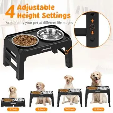 Show more The URPOWER Adjustable Elevated Dog Bowls are the quintessential solution for every dog owner, designed to evolve alongside your pet from their playful puppy days to their graceful senior years. With an ingenious adjustable height feature, these bowls can be tailored to your dog's needs at four distinct levels: 3.7-inch, 9.2-inch, 10.75-inch, and 12.36-inch. This versatility not only caters to dogs of varying sizes but also promotes a healthy eating posture, reducing strain on their joints and fostering efficient digestion.