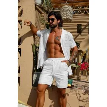 URRU Men's 2 Pieces Outfits Summer Beach Set See Through Sheer Short Sleeve Flower Lace Shirts and Shorts Sets White S