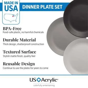 Show more Enjoy every meal and snack with confidence using our American-made 10-inch set of 6 plates, designed not just for convenience but also for safety and style. Crafted from BPA-free durable plastic, this tableware set ensures that you can dine without worrying about harmful chemicals while still embracing quality cuisine. Versatile and chic, these plates feature a textured surface and a round circle design, making them suitable for both indoor and outdoor use.