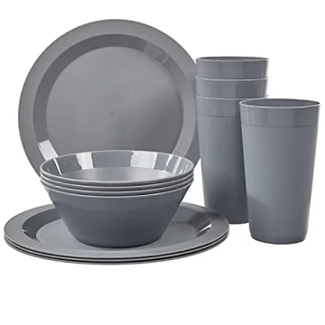 Show moreExperience the ultimate blend of function and style with the US Acrylic Newport Plastic Plate, Bowl and Tumbler Dinnerware Set for 4 in Grey Stone. This versatile 12-piece dining set includes 4 large plates, 4 spacious bowls, and 4 20-ounce tumblers, all crafted to enhance your everyday dining experience. Made in the USA from high-quality, BPA-free plastic, it ensures safety and durability while keeping environmental concerns in mind. Whether you're enjoying a meal indoors or alfresco, this dinnerware set is designed to meet all your dining needs without compromising on quality.