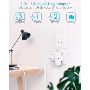 Show more Experience the ultimate convenience with the 6 in 1 Type G Plug Adapter. This innovative travel accessory transforms a single outlet into three standard American outlets, along with one USB-A and two USB-C charging ports. Designed for maximum efficiency, it can handle a capacity of up to 3250 Watts (max 250 Volt and 13 A). Imagine the ease of charging up to six devices simultaneously, whether it’s your cell phone, tablet, or power bank. Gone are the days of lugging around cumbersome power strips; this compact adapter saves valuable suitcase space while ensuring you stay powered up on your journeys.