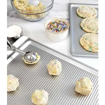 Show moreIntroducing the USA Pan Large Cookie Sheet, a baking essential that transforms your cookie-making experience into a delightful and effortless adventure. Made from heavy-gauge aluminized steel, this baking pan is built to last, providing exceptional durability and reliability that you can count on, year after year. With its raised edge design, transporting your freshly baked goods has never been easier or safer. Thanks to its innovative Americoat non-stick coating, cookies glide off the surface smoothly, allowing for perfect creations every time without the frustration of sticking or crumbling.