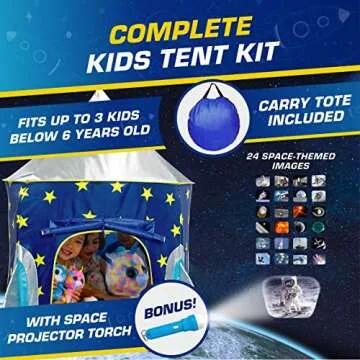 What sets this tent apart is the included space projector toy, featuring 24 fascinating images of planets, stars, and spaceships, enriching the imaginative experience. Thoughtful design elements include mesh windows for ventilation and a wide tie-back door for easy access, allowing parents to keep an eye on their little astronauts. At the end of playtime, the tent can be effortlessly disassembled and neatly packed into its storage bag, perfect for on-the-go adventures. Made from durable, water-resistant polyester, a simple wipe-down with mild soap and water keeps it pristine for future missions!