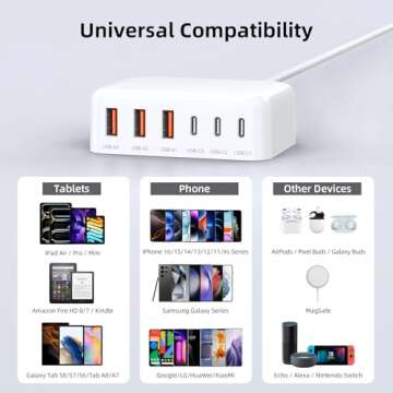 The charger is compatible with all USB-C and USB-A devices, including iPhones, Samsung Galaxy smartphones, iPads, and more.
