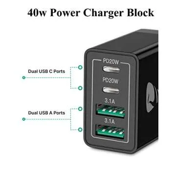 Show more Introducing the ultimate charging solution: the 4-port USB C Wall Charger. Compatible with all your iPhone devices from the latest iPhone 15 series to previous models, this versatile charger is designed for convenience and speed. Featuring a robust 40W power output, it allows you to simultaneously charge up to four devices with ease. With its dual USB-C ports and a USB-A adapter, you can say goodbye to tangled wires and waiting times. This sleek charger not only minimizes clutter but also enhances your efficiency while charging.